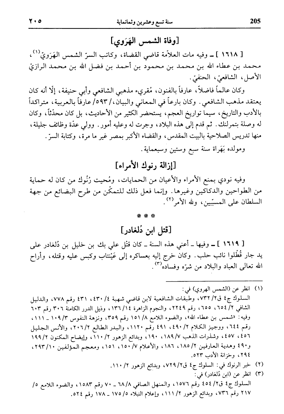 [1619]- وفيها - أعني هذه السنة - كان قتل علي بك بن خليل بن دلغادر على يد جار قطلوا نائب حلب. وكان خرج إليه بعساكره إلى عينتاب وكبس عليه وقتله، وأراح الله تعالى العباد والبلاد من شرّه وفساده (¬3).