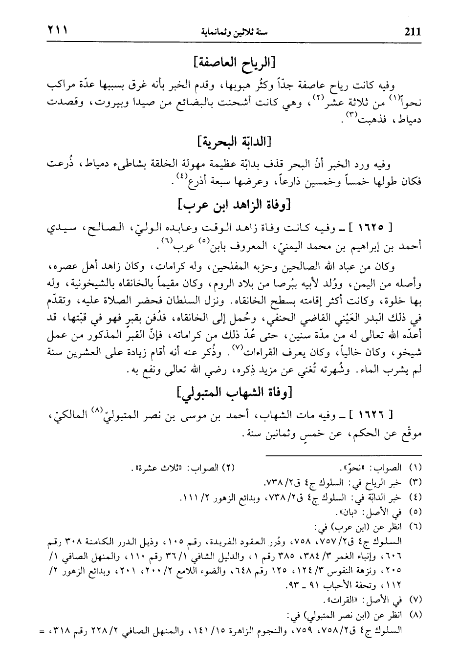 [1625]- وفيه كانت وفاة زاهد الوقت وعابده الوليّ، الصالح، سيدي أحمد بن إبراهيم بن محمد اليمنيّ، المعروف بابن (¬5) عرب (¬6).