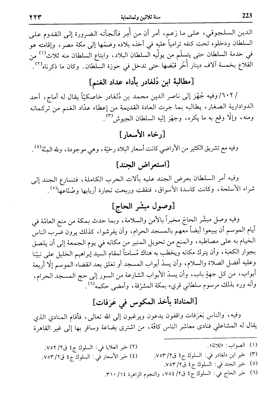 / 602 / وفيه جهّز إلى ناصر الدين محمد بن دلغادر خاصكيّا يقال له أماج، أحد الدوادارية الصغار، يطالبه بما جرت العادة القديمة من إعطاء عدّاد الغنم من تركمانه ومنه، وإلاّ وقع به ما يكره، وجهّز إليه السلطان الجيوش (¬3).