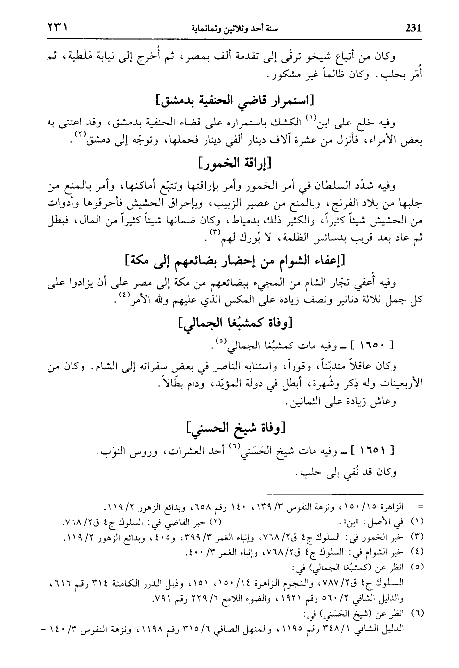 (¬5) انظر عن (كمشبغا الجمالي) في: السلوك ج 4 ق 2/ 787، والنجوم الزاهرة 14/ 150، 151، وذيل الدرر الكامنة 314 رقم 616، والدليل الشافي 2/ 560 رقم 1921، والضوء اللامع 6/ 229 رقم 791.