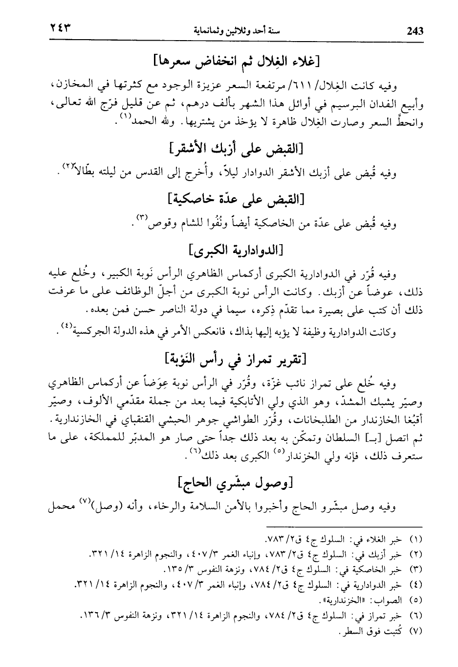 وفيه قرّر في الدوادارية الكبرى أركماس الظاهري الرأس نوبة الكبير، وخلع عليه ذلك، عوضا عن أزبك. وكانت الرأس نوبة الكبرى من أجلّ الوظائف على ما عرفت ذلك أن كتب على بصيرة مما تقدّم ذكره، سيما في دولة الناصر حسن فمن بعده.