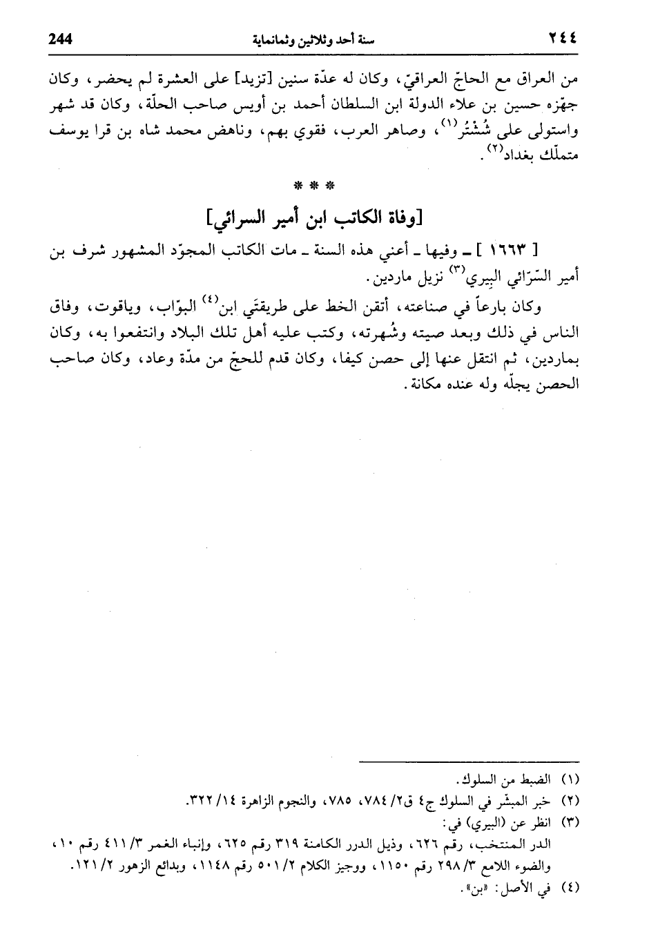 [1663]- وفيها - أعني هذه السنة - مات الكاتب المجوّد المشهور شرف بن أمير السّرّائي البيري (¬3) نزيل ماردين.