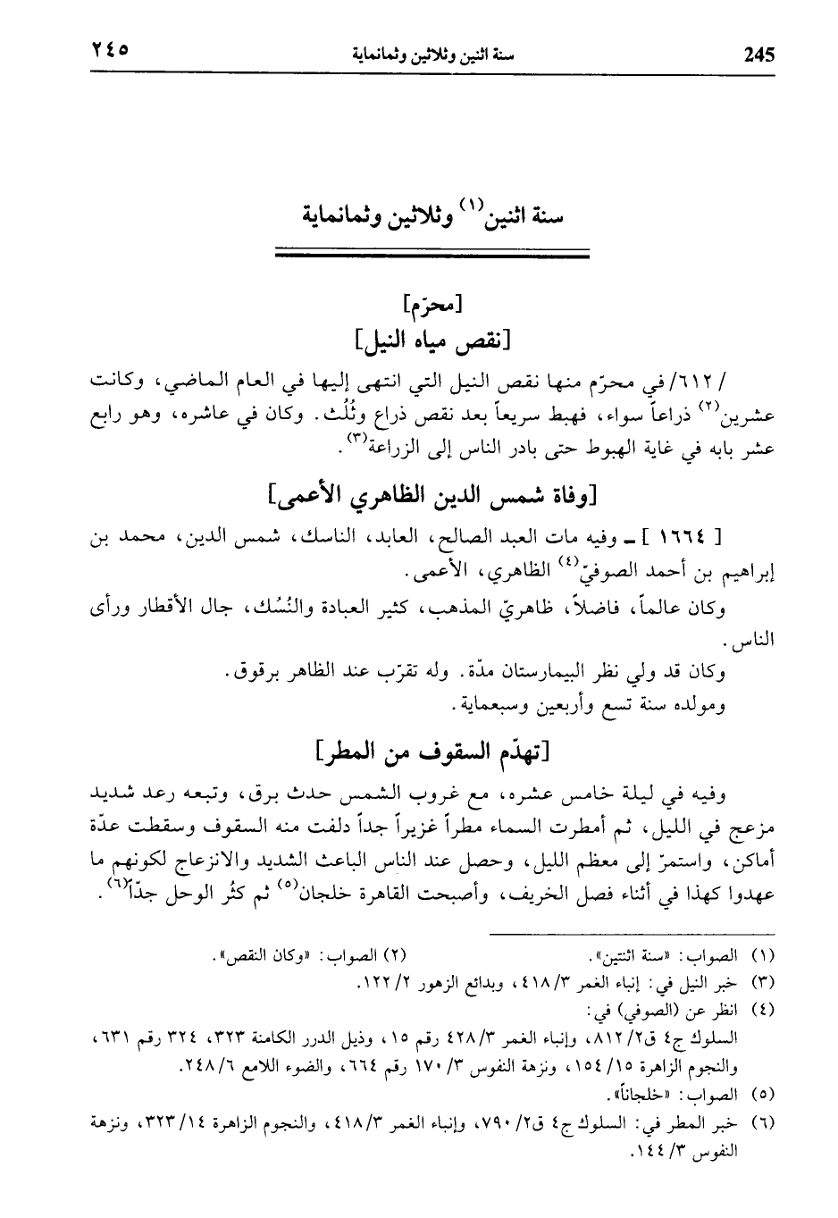 / 612 / في محرّم منها نقص النيل التي انتهى إليها في العام الماضي، وكانت عشرين (¬2) ذراعا سواء، فهبط سريعا بعد نقص ذراع وثلث. وكان في عاشره، وهو رابع عشر بابه في غاية الهبوط حتى بادر الناس إلى الزراعة (¬3).