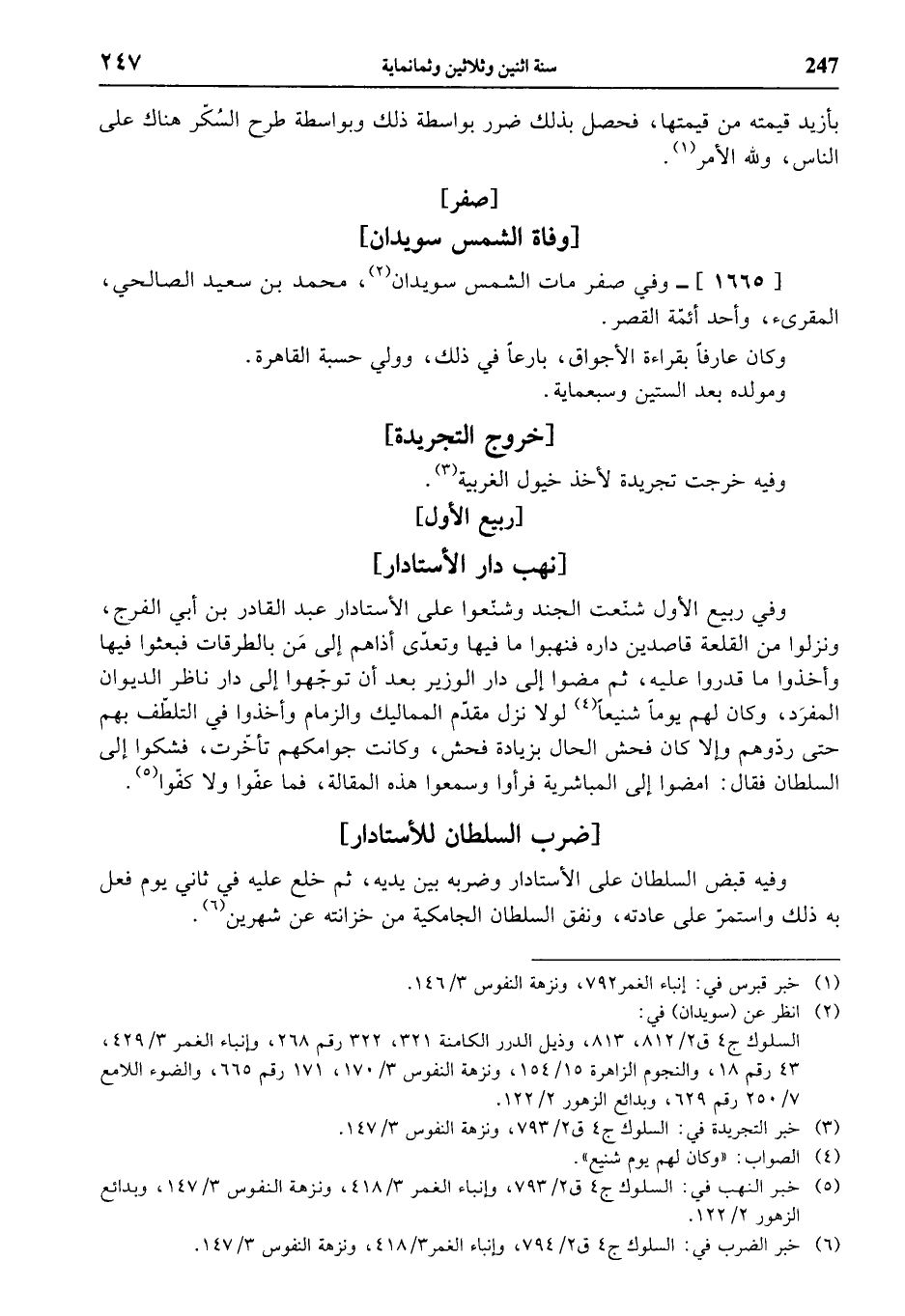 (¬6) خبر الضرب في: السلوك ج 4 ق 2/ 794، وإنباء الغمر 3/ 418، ونزهة النفوس 3/ 147.