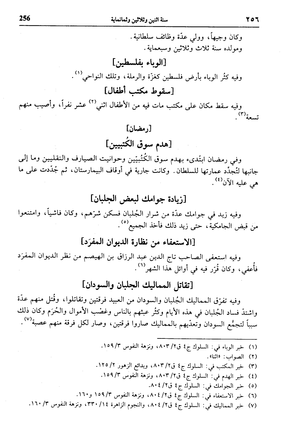 وفيه تفرّق المماليك الجلبان والسودان من العبيد فرقتين وتقاتلوا، وقتل منهم عدّة واشتدّ فساد الجلبان في هذه الأيام وكثر عبثهم بالناس وغصب الأموال والحرم وكان ذلك سببا لتجمّع السودان وتعدّيهم بالمماليك صاروا فرقتين، وصار لكل فرقة منهم عصبة (¬7).