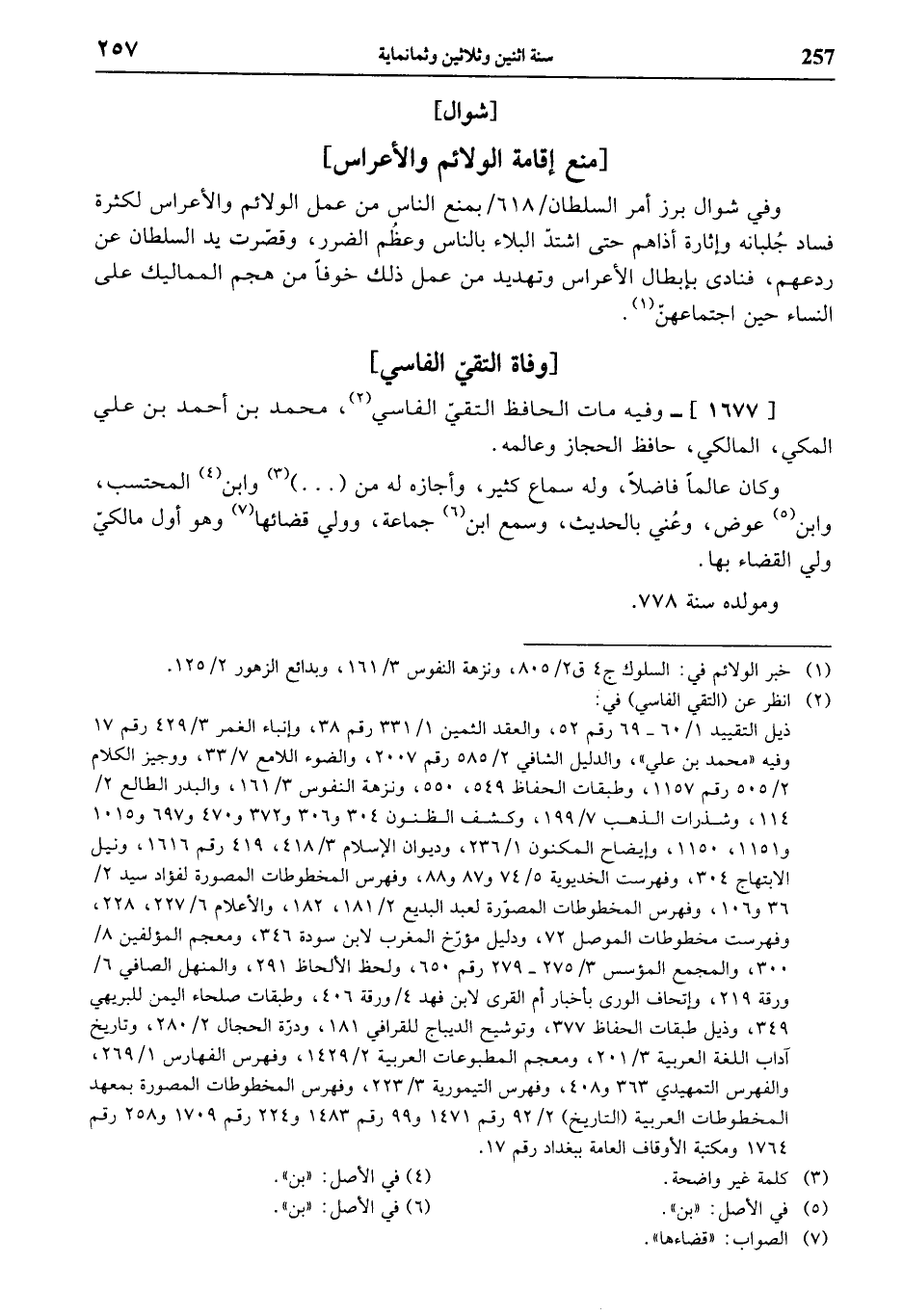 (¬2) انظر عن (التقي الفاسي) في: ذيل التقييد 1/ 60 - 69 رقم 52، والعقد الثمين 1/ 331 رقم 38، وإنباء الغمر 3/ 429 رقم 17 وفيه «محمد بن علي»، والدليل الشافي 2/ 585 رقم 2007، والضوء اللامع 7/ 33، ووجيز الكلام 2/ 505 رقم 1157، وطبقات الحفاظ 549، 550، ونزهة النفوس 3/ 161، والبدر الطالع 2/ 114، وشذرات الذهب 7/ 199، وكشف الظنون 304 و 306 و 372 و 470 و 697 و 1015 و 1151، 1150، وإيضاح المكنون 1/ 236، وديوان الإسلام 3/ 418، 419 رقم 1616، ونيل الابتهاج 304، وفهرست الخديوية 5/ 74 و 87 و 88، وفهرس المخطوطات المصورة لفؤاد سيد 2/ 36 و 106، وفهرس المخطوطات المصوّرة لعبد البديع 2/ 181، 182، والأعلام 6/ 227، 228، وفهرست مخطوطات الموصل 72، ودليل مؤرّخ المغرب لابن سودة 346، ومعجم المؤلفين 8/ 300، والمجمع المؤسس 3/ 275 - 279 رقم 650، ولحظ الألحاظ 291، والمنهل الصافي 6 / ورقة 219، وإتحاف الورى بأخبار أم القرى لابن فهد 4 / ورقة 406، وطبقات صلحاء اليمن للبريهي 349، وذيل طبقات الحفاظ 377، وتوشيح الديباج للقرافي 181، ودرّة الحجال 2/ 280، وتاريخ آداب اللغة العربية 3/ 201، ومعجم المطبوعات العربية 2/ 1429، وفهرس الفهارس 1/ 269، والفهرس التمهيدي 363 و 408، وفهرس التيمورية 3/ 223، وفهرس المخطوطات المصورة بمعهد المخطوطات العربية (التاريخ) 2/ 92 رقم 1471 و 99 رقم 1483 و 224 رقم 1709 و 258 رقم 1764 ومكتبة الأوقاف العامة ببغداد رقم 17.