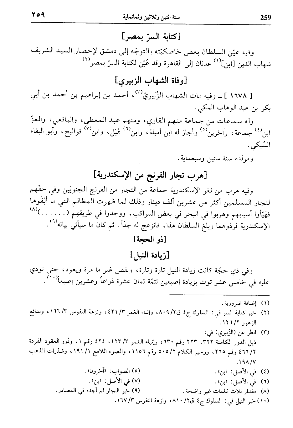 (¬3) انظر عن (الزبيري) في: ذيل الدرر الكامنة 322، 223 رقم 630، وإنباء الغمر 3/ 423، 424 رقم 1، ودرر العقود الفردة 2/ 466 رقم 265، ووجيز الكلام 2/ 505 رقم 1156، والضوء اللامع 1/ 191، وشذرات الذهب 7/ 198.
