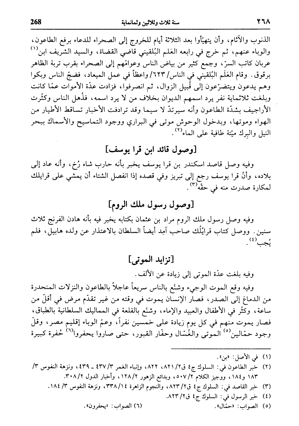 (¬2) خبر الطاعون في: السلوك ج 4 ق 2/ 821، 822، وإنباء الغمر 3/ 437 - 439، ونزهة النفوس 3/ 183 و 184، ووجيز الكلام 2/ 507، وبدائع الزهور 2/ 128، وأخبار الدول 2/ 308.
