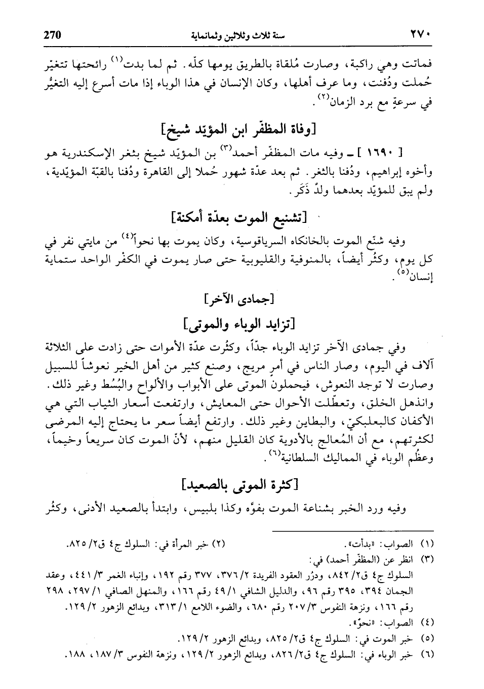 (¬6) خبر الوباء في: السلوك ج 4 ق 2/ 826، وبدائع الزهور 2/ 129، ونزهة النفوس 3/ 187، 188.