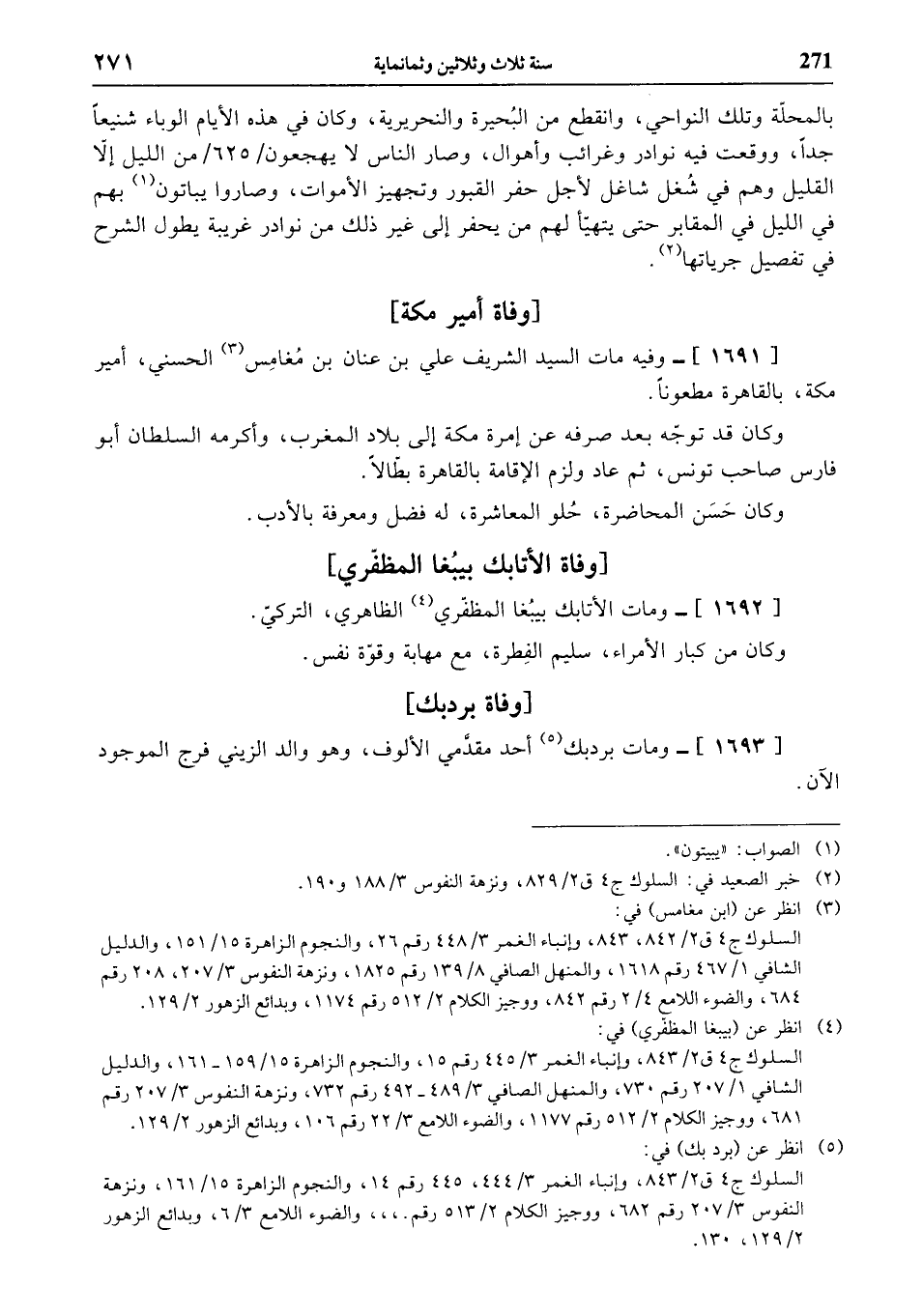 بالمحلّة وتلك النواحي، وانقطع من البحيرة والنحريرية، وكان في هذه الأيام الوباء شنيعا جدا، ووقعت فيه نوادر وغرائب وأهوال، وصار الناس لا يهجعون / 625 / من الليل إلاّ القليل وهم في شغل شاغل لأجل حفر القبور وتجهيز الأموات، وصاروا يباتون (¬1) بهم في الليل في المقابر حتى يتهيّأ لهم من يحفر إلى غير ذلك من نوادر غريبة يطول الشرح في تفصيل جرياتها (¬2).