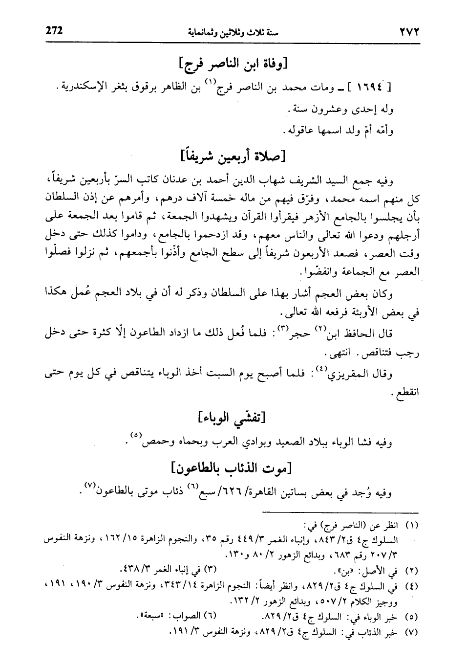 وفيه جمع السيد الشريف شهاب الدين أحمد بن عدنان كاتب السرّ بأربعين شريفا، كل منهم اسمه محمد، وفرّق فيهم من ماله خمسة آلاف درهم، وأمرهم عن إذن السلطان بأن يجلسوا بالجامع الأزهر فيقرأوا القرآن ويشهدوا الجمعة، ثم قاموا بعد الجمعة على أرجلهم ودعوا الله تعالى والناس معهم، وقد ازدحموا بالجامع، وداموا كذلك حتى دخل وقت العصر، فصعد الأربعون شريفا إلى سطح الجامع وأذّنوا بأجمعهم، ثم نزلوا فصلّوا العصر مع الجماعة وانفضّوا.