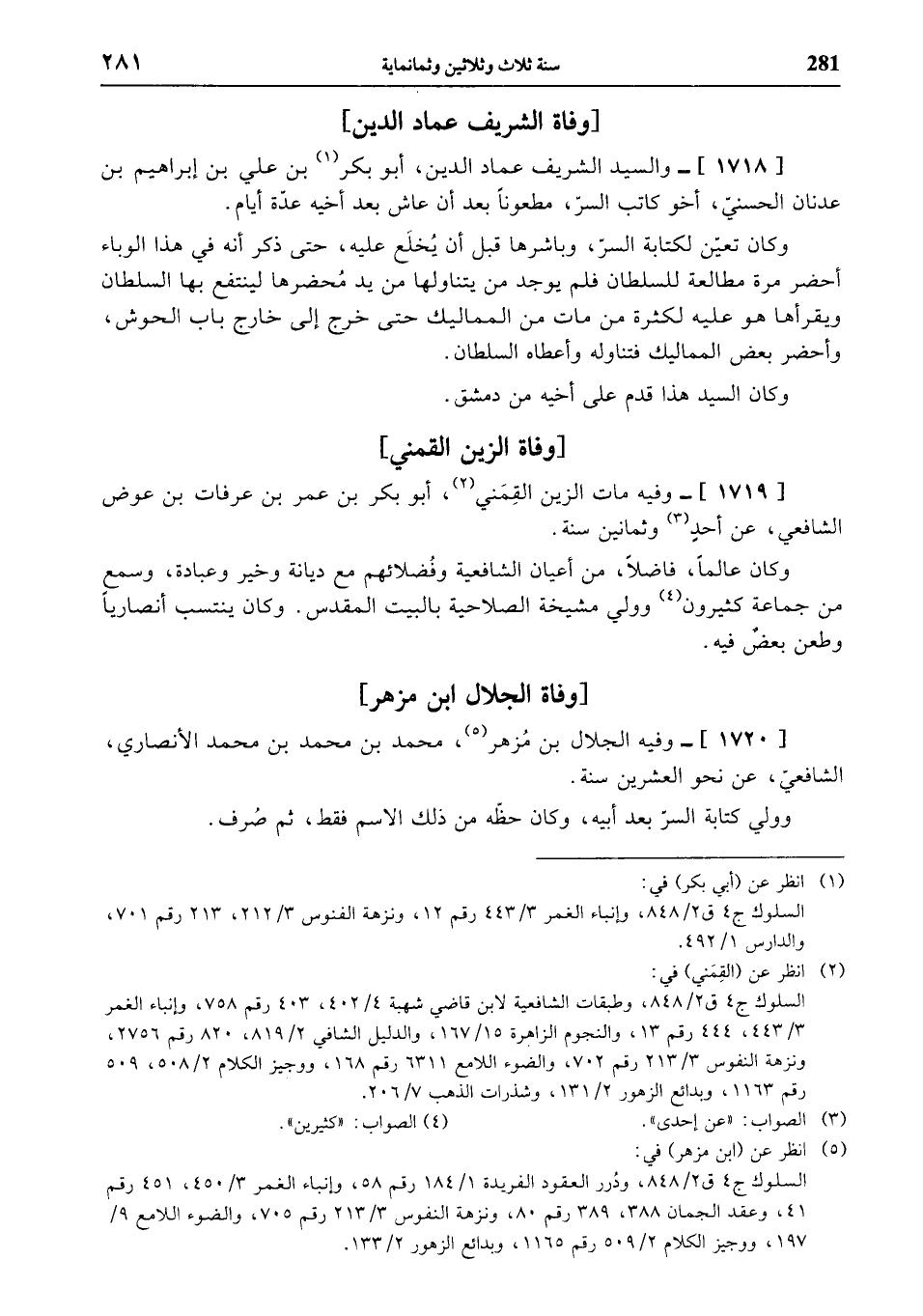(¬2) انظر عن (القمني) في: السلوك ج 4 ق 2/ 848، وطبقات الشافعية لابن قاضي شهبة 4/ 402، 403 رقم 758، وإنباء الغمر 3/ 443، 444 رقم 13، والنجوم الزاهرة 15/ 167، والدليل الشافي 2/ 819، 820 رقم 2756، ونزهة النفوس 3/ 213 رقم 702، والضوء اللامع 6311 رقم 168، ووجيز الكلام 2/ 508، 509 رقم 1163، وبدائع الزهور 2/ 131، وشذرات الذهب 7/ 206.