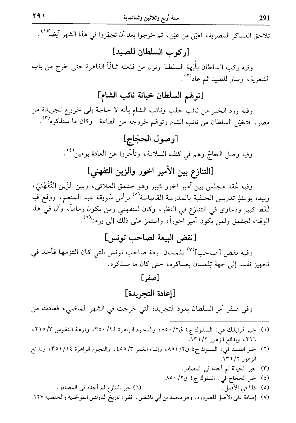 وفيه ورد الخبر من نائب حلب ونائب الشام بأنه لا حاجة إلى خروج تجريدة من مصر، فتخيّل السلطان من نائب الشام وتوهّم خروجه عن الطاعة. وكان ما سنذكره (¬3).