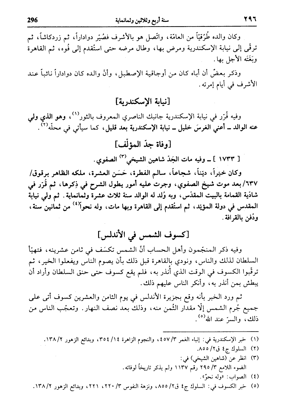 (¬5) خبر الكسوف في: السلوك ج 4 ق 2/ 855، ونزهة النفوس 3/ 220، 221، وبدائع الزهور 2/ 138.