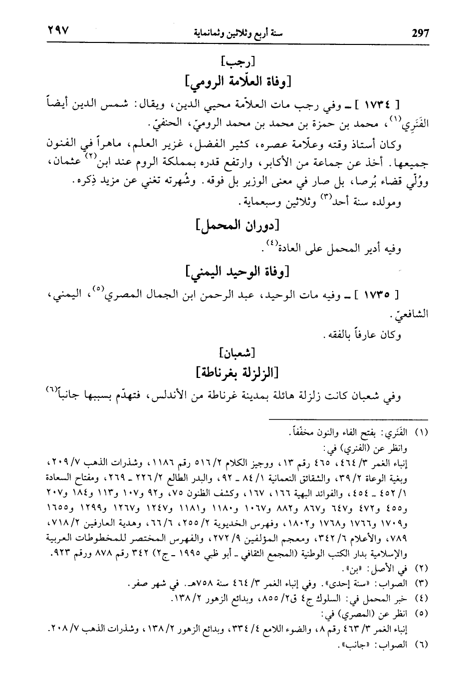 [1734]- وفي رجب مات العلاّمة محيي الدين، ويقال: شمس الدين أيضا الفنري (¬1)، محمد بن حمزة بن محمد بن محمد الروميّ، الحنفيّ.