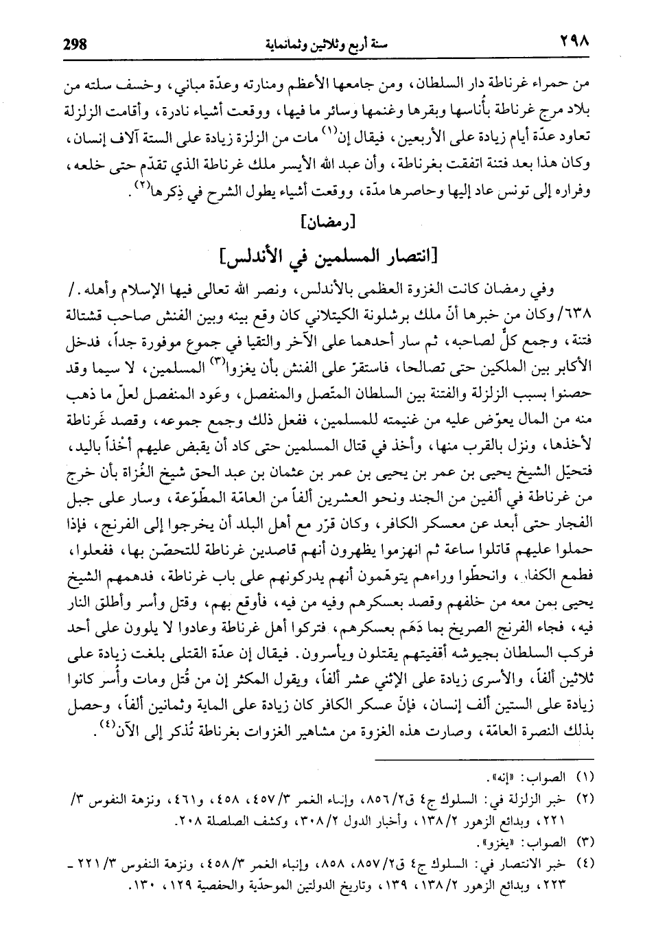 وفي رمضان كانت الغزوة العظمى بالأندلس، ونصر الله تعالى فيها الإسلام وأهله. / 638 / وكان من خبرها أنّ ملك برشلونة الكيتلاني كان وقع بينه وبين الفنش صاحب قشتالة فتنة، وجمع كلّ لصاحبه، ثم سار أحدهما على الآخر والتقيا في جموع موفورة جدا، فدخل الأكابر بين الملكين حتى تصالحا، فاستقرّ على الفنش بأن يغزوا (¬3) المسلمين، لا سيما وقد حصنوا بسبب الزلزلة والفتنة بين السلطان المتّصل والمنفصل، وعود المنفصل لعلّ ما ذهب منه من المال يعوّض عليه من غنيمته للمسلمين، ففعل ذلك وجمع جموعه، وقصد غرناطة لأخذها، ونزل بالقرب منها، وأخذ في قتال المسلمين حتى كاد أن يقبض عليهم أخذا باليد، فتحيّل الشيخ يحيى بن عمر بن يحيى بن عمر بن عثمان بن عبد الحق شيخ الغزاة بأن خرج من غرناطة في ألفين من الجند ونحو العشرين ألفا من العامّة المطّوّعة، وسار على جبل الفجار حتى أبعد عن معسكر الكافر، وكان قرّر مع أهل البلد أن يخرجوا إلى الفرنج، فإذا حملوا عليهم قاتلوا ساعة ثم انهزموا يظهرون أنهم قاصدين غرناطة للتحصّن بها، ففعلوا، فطمع الكفار، وانحطّوا وراءهم يتوهّمون أنهم يدركونهم على باب غرناطة، فدهمهم الشيخ يحيى بمن معه من خلفهم وقصد بعسكرهم وفيه من فيه، فأوقع بهم، وقتل وأسر وأطلق النار فيه، فجاء الفرنج الصريخ بما دهم بعسكرهم، فتركوا أهل غرناطة وعادوا لا يلوون على أحد فركب السلطان بجيوشه أقفيتهم يقتلون ويأسرون. فيقال إن عدّة القتلى بلغت زيادة على ثلاثين ألفا، والأسرى زيادة على الإثني عشر ألفا، ويقول المكثر إن من قتل ومات وأسر كانوا زيادة على الستين ألف إنسان، فإنّ عسكر الكافر كان زيادة على الماية وثمانين ألفا، وحصل بذلك النصرة العامّة، وصارت هذه الغزوة من مشاهير الغزوات بغرناطة تذكر إلى الآن (¬4).