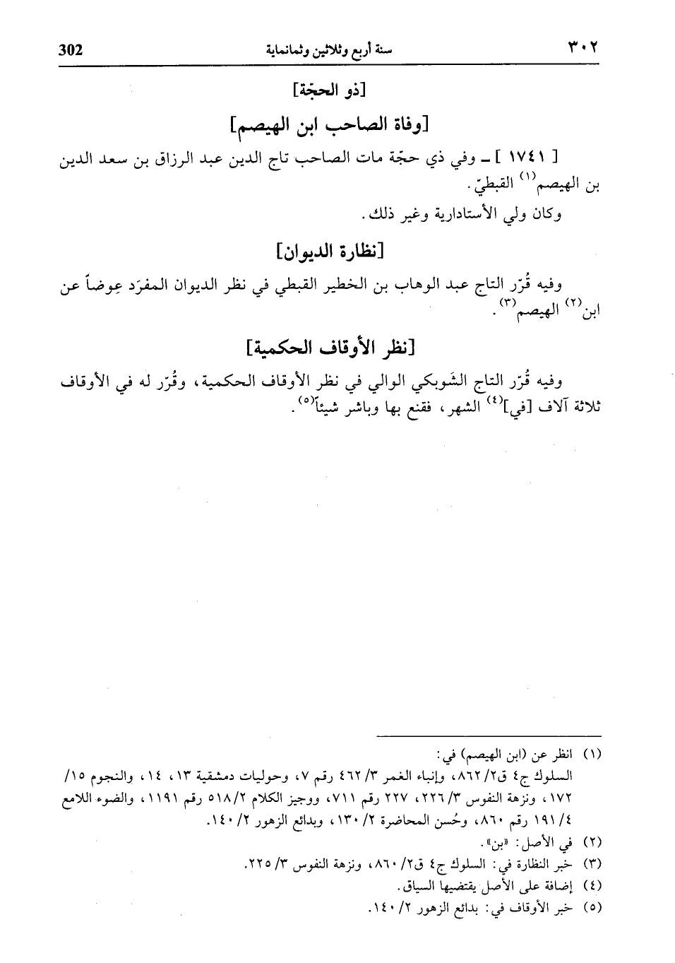 (¬1) انظر عن (ابن الهيصم) في: السلوك ج 4 ق 2/ 862، وإنباء الغمر 3/ 462 رقم 7، وحوليات دمشقية 13، 14، والنجوم 15/ 172، ونزهة النفوس 3/ 226، 227 رقم 711، ووجيز الكلام 2/ 518 رقم 1191، والضوء اللامع 4/ 191 رقم 860، وحسن المحاضرة 2/ 130، وبدائع الزهور 2/ 140.