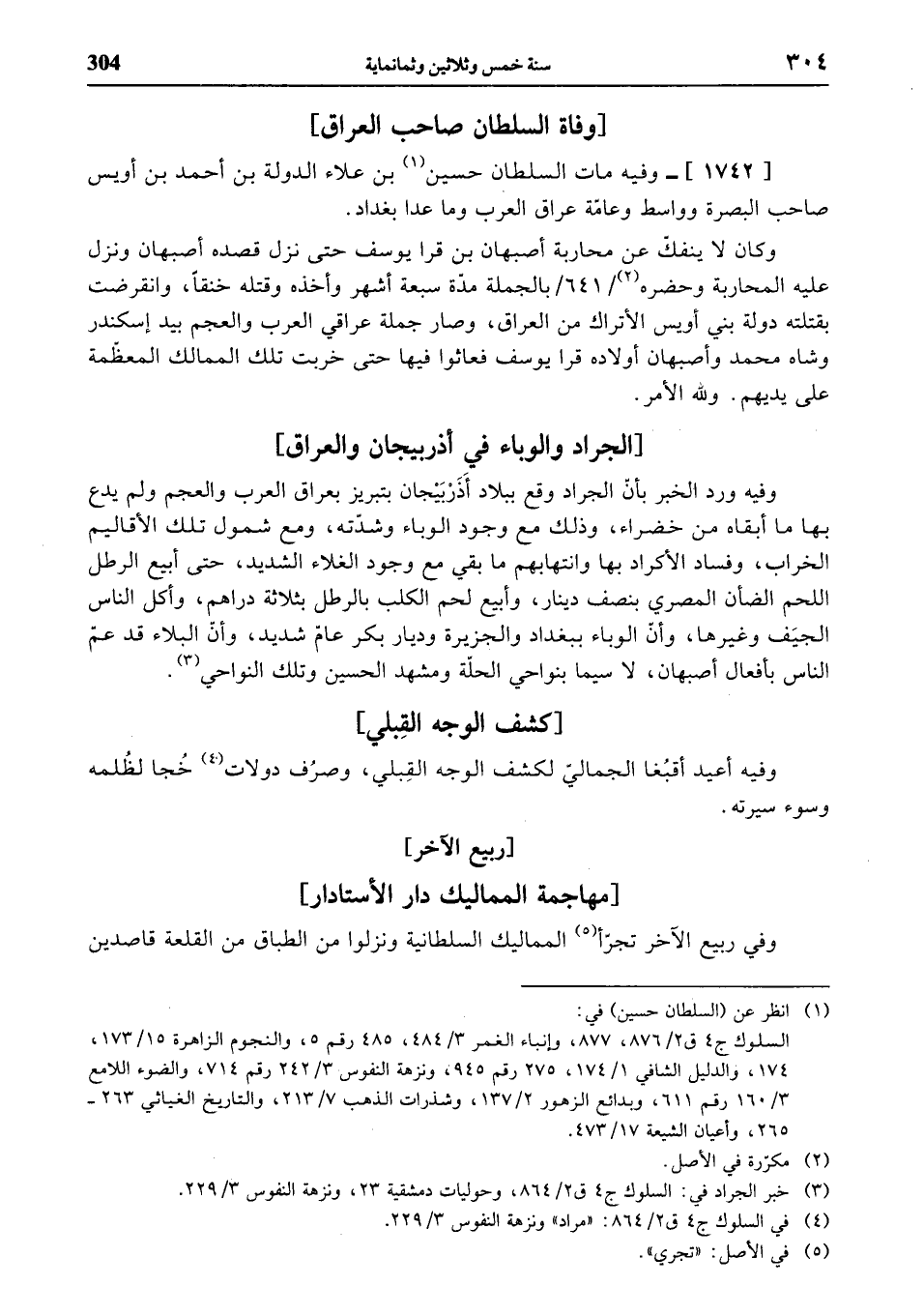 [1742]- وفيه مات السلطان حسين (¬1) بن علاء الدولة بن أحمد بن أويس صاحب البصرة وواسط وعامّة عراق العرب وما عدا بغداد.