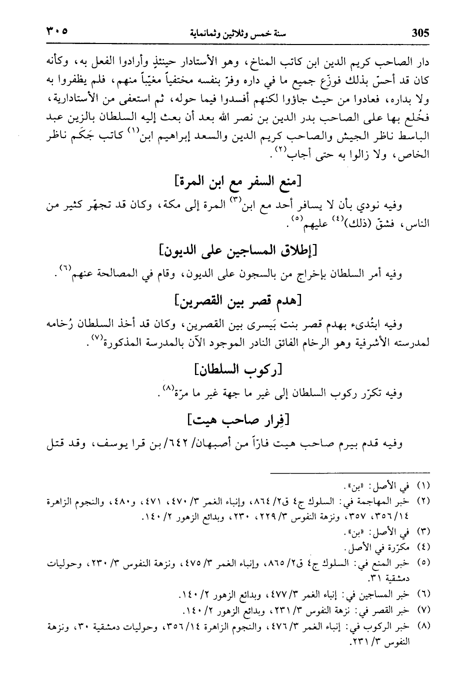 (¬5) خبر المنع في: السلوك ج 4 ق 2/ 865، وإنباء الغمر 3/ 475، ونزهة النفوس 3/ 230، وحوليات دمشقية 31.