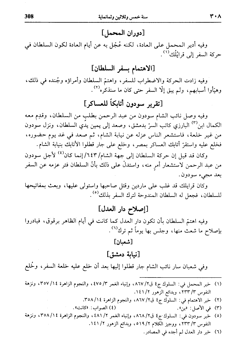 (¬5) خبر سودون في: السلوك ج 4 ق 2/ 868، وإنباء الغمر 2/ 481، والنجوم الزاهرة 14/ 358، ونزهة النفوس 3/ 233، ووجيز الكلام 2/ 519، وبدائع الزهور 2/ 141.