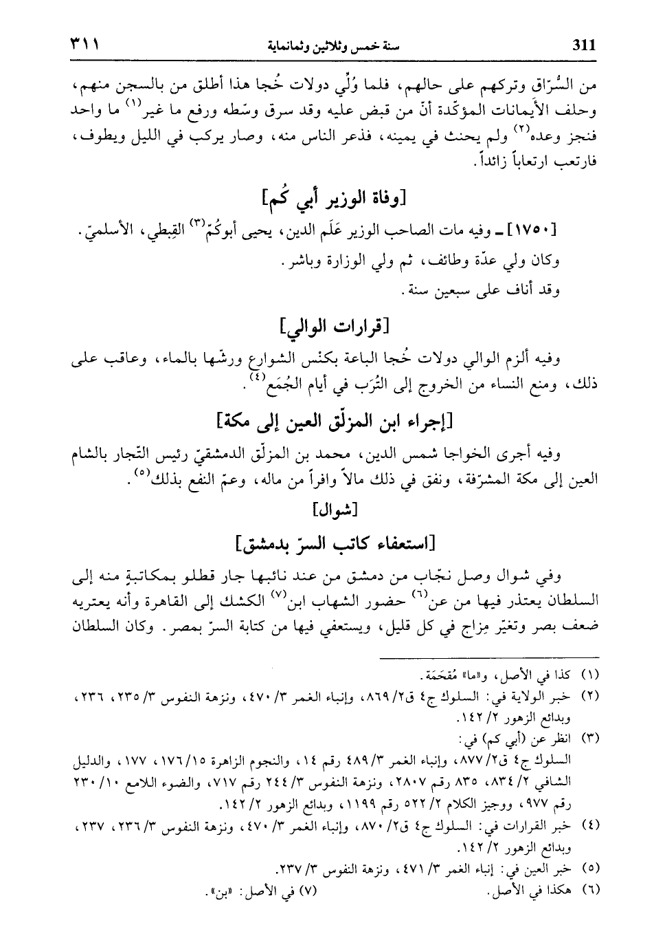 (¬3) انظر عن (أبي كم) في: السلوك ج 4 ق 2/ 877، وإنباء الغمر 3/ 489 رقم 14، والنجوم الزاهرة 15/ 176، 177، والدليل الشافي 2/ 834، 835 رقم 2807، ونزهة النفوس 3/ 244 رقم 717، والضوء اللامع 10/ 230 رقم 977، ووجيز الكلام 2/ 522 رقم 1199، وبدائع الزهور 2/ 142.