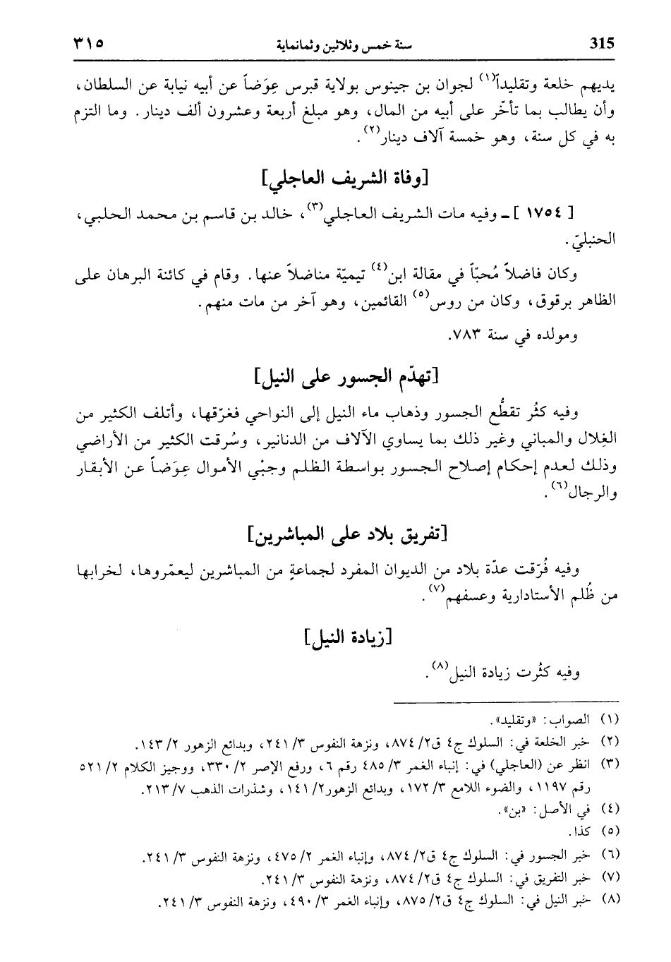 (¬6) خبر الجسور في: السلوك ج 4 ق 2/ 874، وإنباء الغمر 2/ 475، ونزهة النفوس 3/ 241.