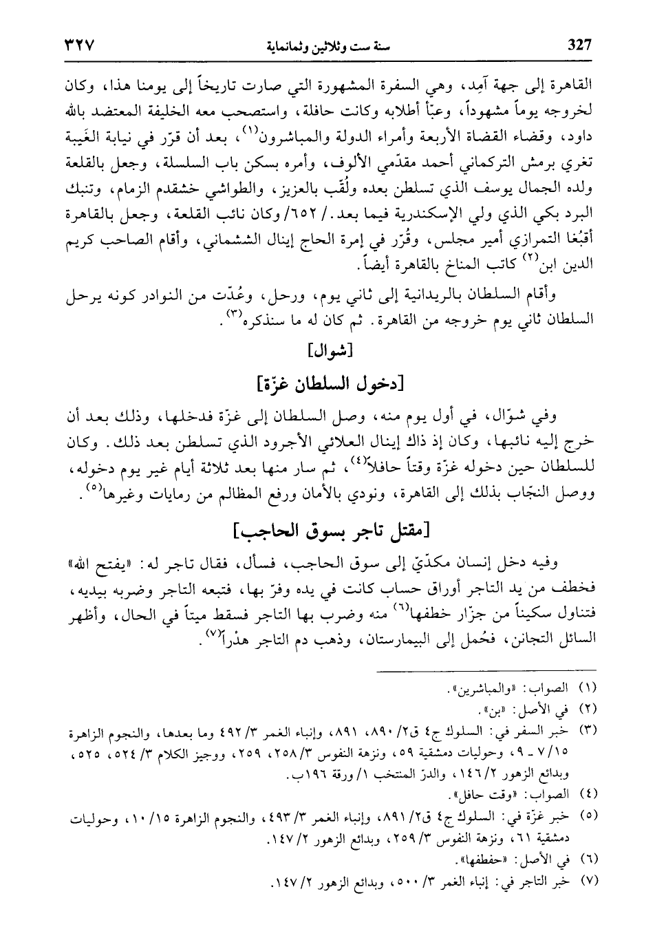 (¬7) خبر التاجر في: إنباء الغمر 3/ 500، وبدائع الزهور 2/ 147.