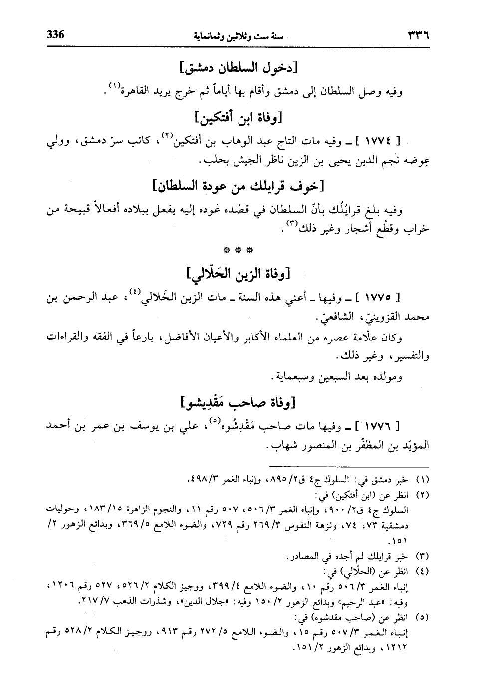 [1774]- وفيه مات التاج عبد الوهاب بن أفتكين (¬2)، كاتب سرّ دمشق، وولي عوضه نجم الدين يحيى بن الزين ناظر الجيش بحلب.