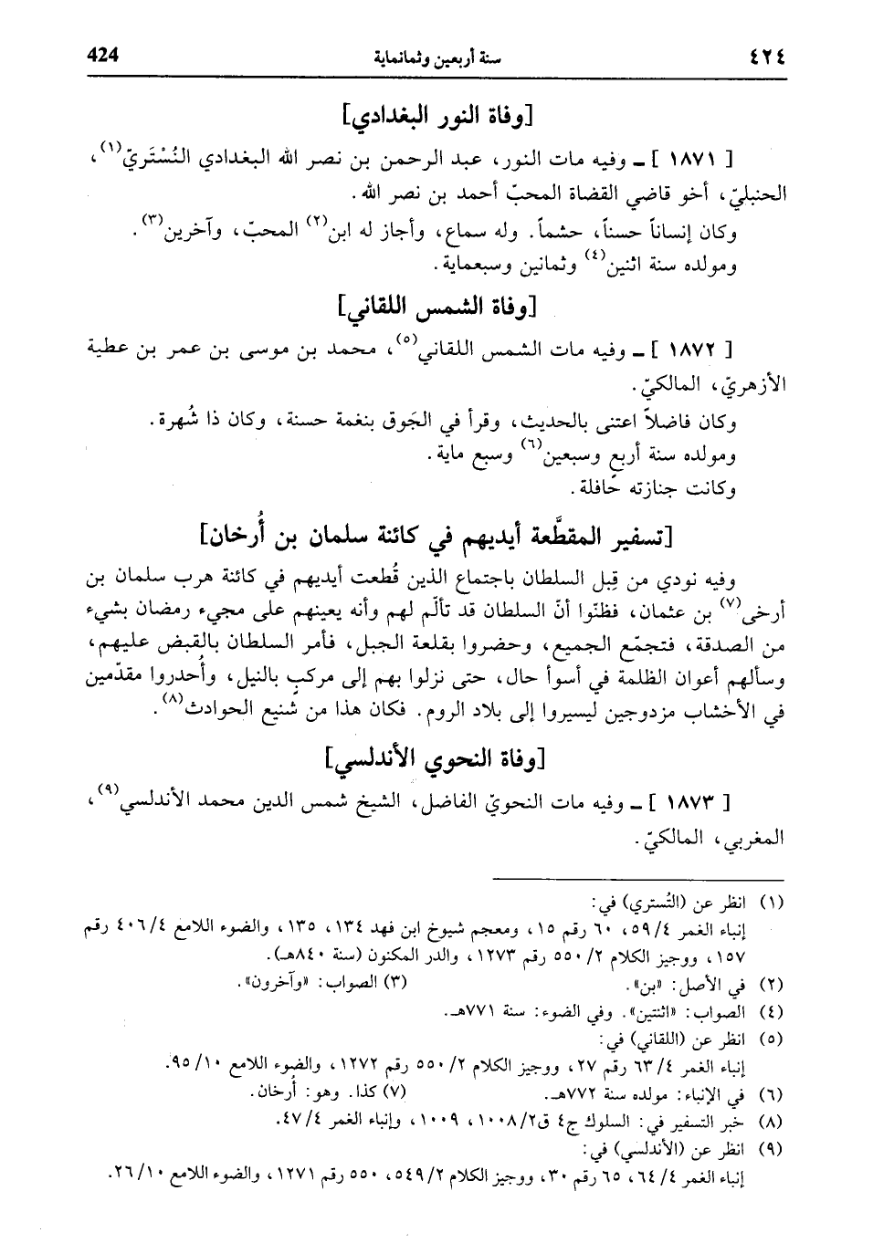 (¬5) انظر عن (اللقاني) في: إنباء الغمر 4/ 63 رقم 27، ووجيز الكلام 2/ 550 رقم 1272، والضوء اللامع 10/ 95.