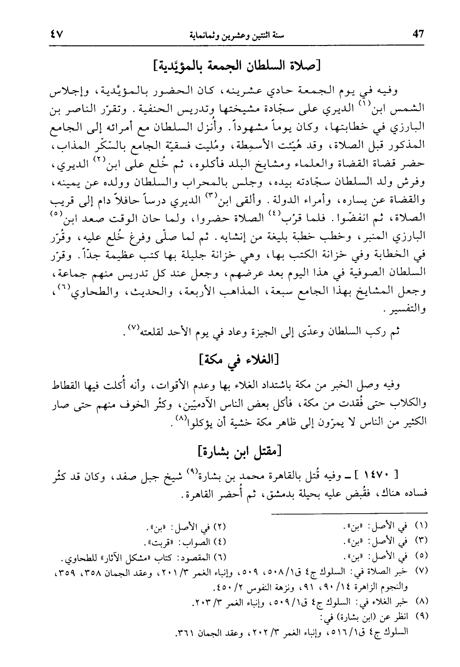(¬7) خبر الصلاة في: السلوك ج 4 ق 1/ 508، 509، وإنباء الغمر 3/ 201، وعقد الجمان 358، 359، والنجوم الزاهرة 14/ 90، 91، ونزهة النفوس 2/ 450.