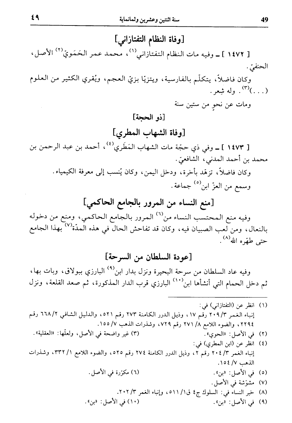 (¬1) انظر عن (التفتازاني) في: إنباء الغمر 3/ 209 رقم 17، وذيل الدرر الكامنة 273 رقم 521، والدليل الشافي 2/ 668 رقم 2294، والضوء اللامع 8/ 271 رقم 729، وشذرات الذهب 7/ 155.