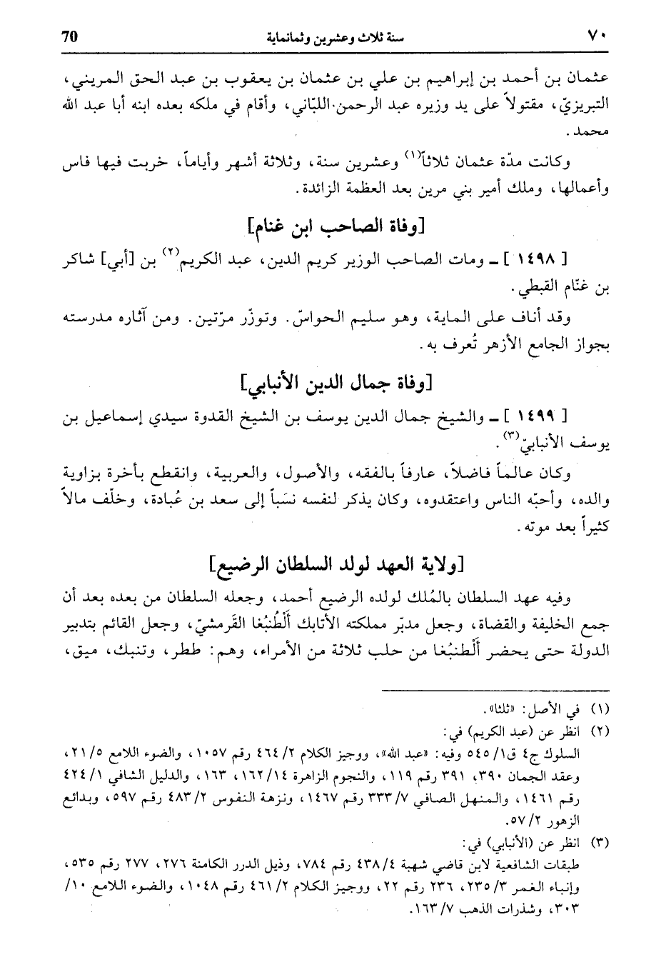 (¬2) انظر عن (عبد الكريم) في: السلوك ج 4 ق 1/ 545 وفيه: «عبد الله»، ووجيز الكلام 2/ 464 رقم 1057، والضوء اللامع 5/ 21، وعقد الجمان 390، 391 رقم 119، والنجوم الزاهرة 14/ 162، 163، والدليل الشافي 1/ 424 رقم 1461، والمنهل الصافي 7/ 333 رقم 1467، ونزهة النفوس 2/ 483 رقم 597، وبدائع الزهور 2/ 57.
