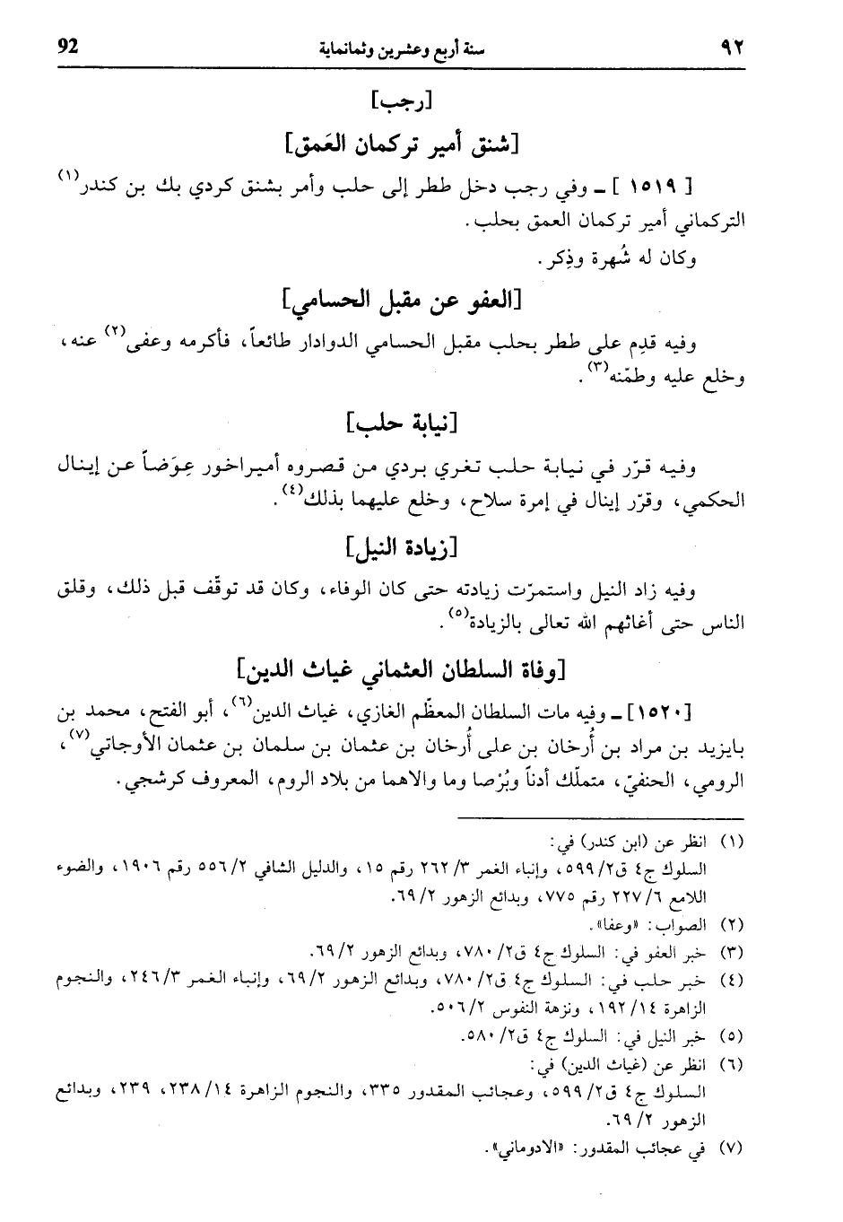 (¬4) خبر حلب في: السلوك ج 4 ق 2/ 780، وبدائع الزهور 2/ 69، وإنباء الغمر 3/ 246، والنجوم الزاهرة 14/ 192، ونزهة النفوس 2/ 506.