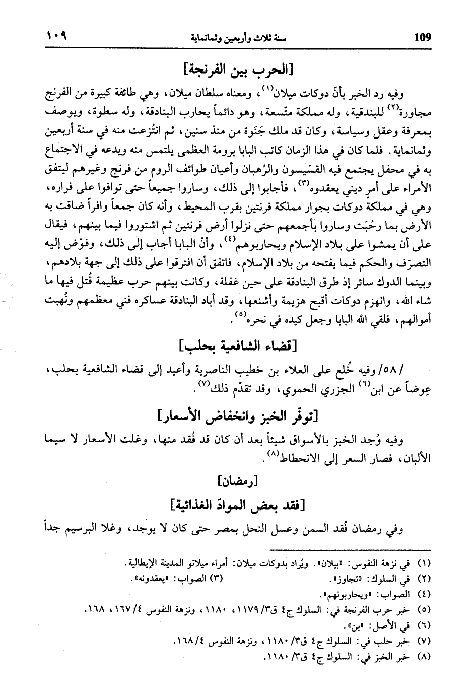 (¬7) خبر حلب في: السلوك ج 4 ق 3/ 1180، ونزهة النفوس 4/ 168.