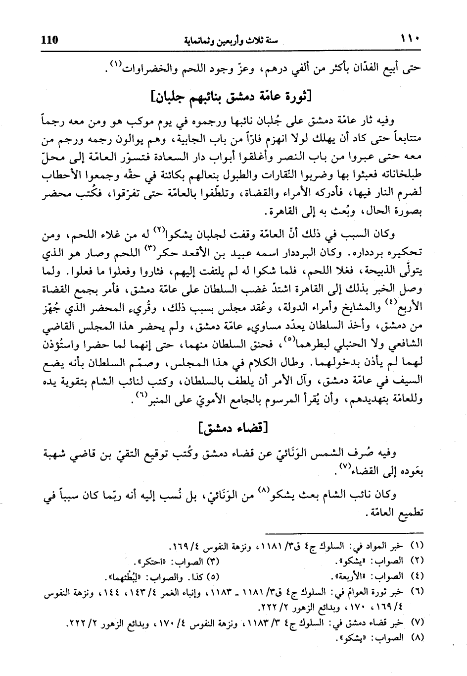 (¬6) خبر ثورة العوامّ في: السلوك ج 4 ق 3/ 1181 - 1183، وإنباء الغمر 4/ 143، 144، ونزهة النفوس 4/ 169، 170، وبدائع الزهور 2/ 222.