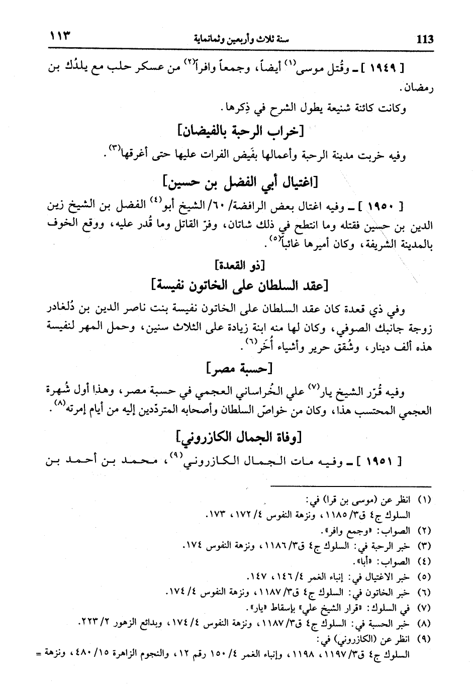 [1949]- وقتل موسى (¬1) أيضا، وجمعا وافرا (¬2) من عسكر حلب مع يلدك بن رمضان.