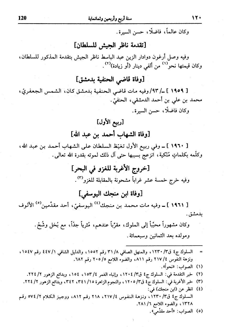 (¬4) انظر عن (ابن منجك) في: السلوك ج 4 ق 3/ 1230، ونزهة النفوس 4/ 217، 218 رقم 812، ووجيز الكلام 2/ 574 رقم 1328، والضوء اللامع 6/ 281.