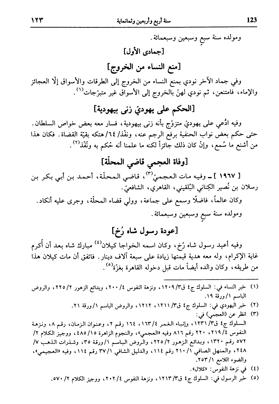 وفيه ادّعي على يهوديّ متزوّج بأنه زنى بيهودية، فسار معه بعض خواص السلطان. حتى حكم بعض نواب الحنفية برفع الرجم عنه، ونفّذ / 64 / هتكه بقيّة القضاة. فكان هذا من أشنع ما سمع، وإن كان ذلك جائزا لكنه ما علمنا أنه حكم به ونفّذ (¬2).