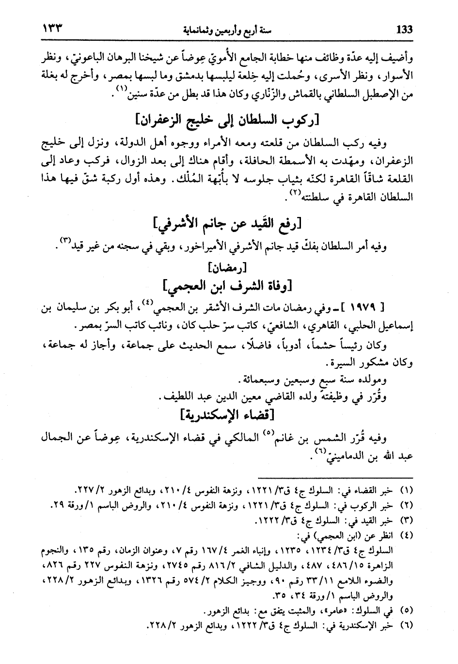 (¬4) انظر عن (ابن العجمي) في: السلوك ج 4 ق 3/ 1234، 1235، وإنباء الغمر 4/ 167 رقم 7، وعنوان الزمان، رقم 135، والنجوم الزاهرة 15/ 486، 487، والدليل الشافي 2/ 816 رقم 2745، ونزهة النفوس 227 رقم 826، والضوء اللامع 11/ 33 رقم 90، ووجيز الكلام 2/ 574 رقم 1326، وبدائع الزهور 2/ 228، والروض الباسم 1 / ورقة 34، 35.