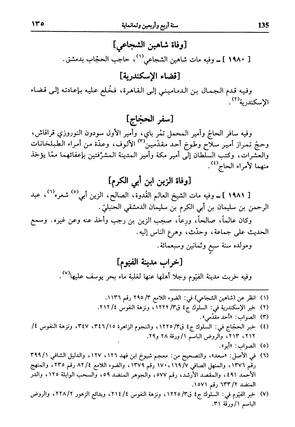 (¬7) خبر الفيّوم في: السلوك ج 4 ق 3/ 1225، ونزهة النفوس 4/ 214، وبدائع الزهور 2/ 228، والروض الباسم 1 / ورقة 31.