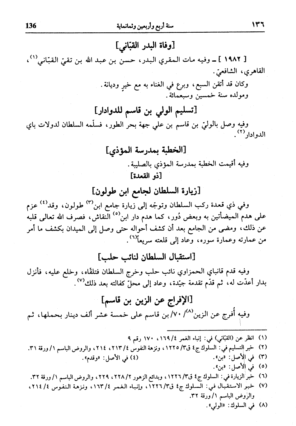 (¬7) خبر الاستقبال في: السلوك ج 4 ق 3/ 1226، وإنباء الغمر 4/ 163، ونزهة النفوس 4/ 214، والروض الباسم 1 / ورقة 32.