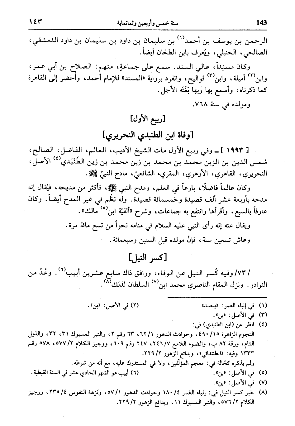 (¬4) انظر عن (ابن الطنبدي) في: النجوم الزاهرة 15/ 490، وحوادث الدهور 1/ 62، 63 رقم 2، والتبر المسبوك 31، 32، والذيل التام، ورقة 82 ب، والضوء اللامع 7/ 246، 247 رقم 609، ووجيز الكلام 2/ 577، 578 رقم 1333 وفيه: «الطنتدائي»، وبدائع الزهور 2/ 229. ولم يذكره كحّالة في: معجم المؤلّفين، ولا في المستدرك عليه، مع أنه من شرطه.