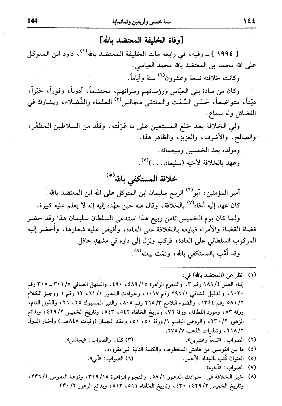 (¬8) خبر الخلافة في: حوادث الدهور 1/ 58، والنجوم الزاهرة 15/ 349، ونزهة النفوس 4/ 236، وتاريخ الخميس 2/ 429، 430، وتاريخ الخلفاء 511، 512، وبدائع الزهور 2/ 230.