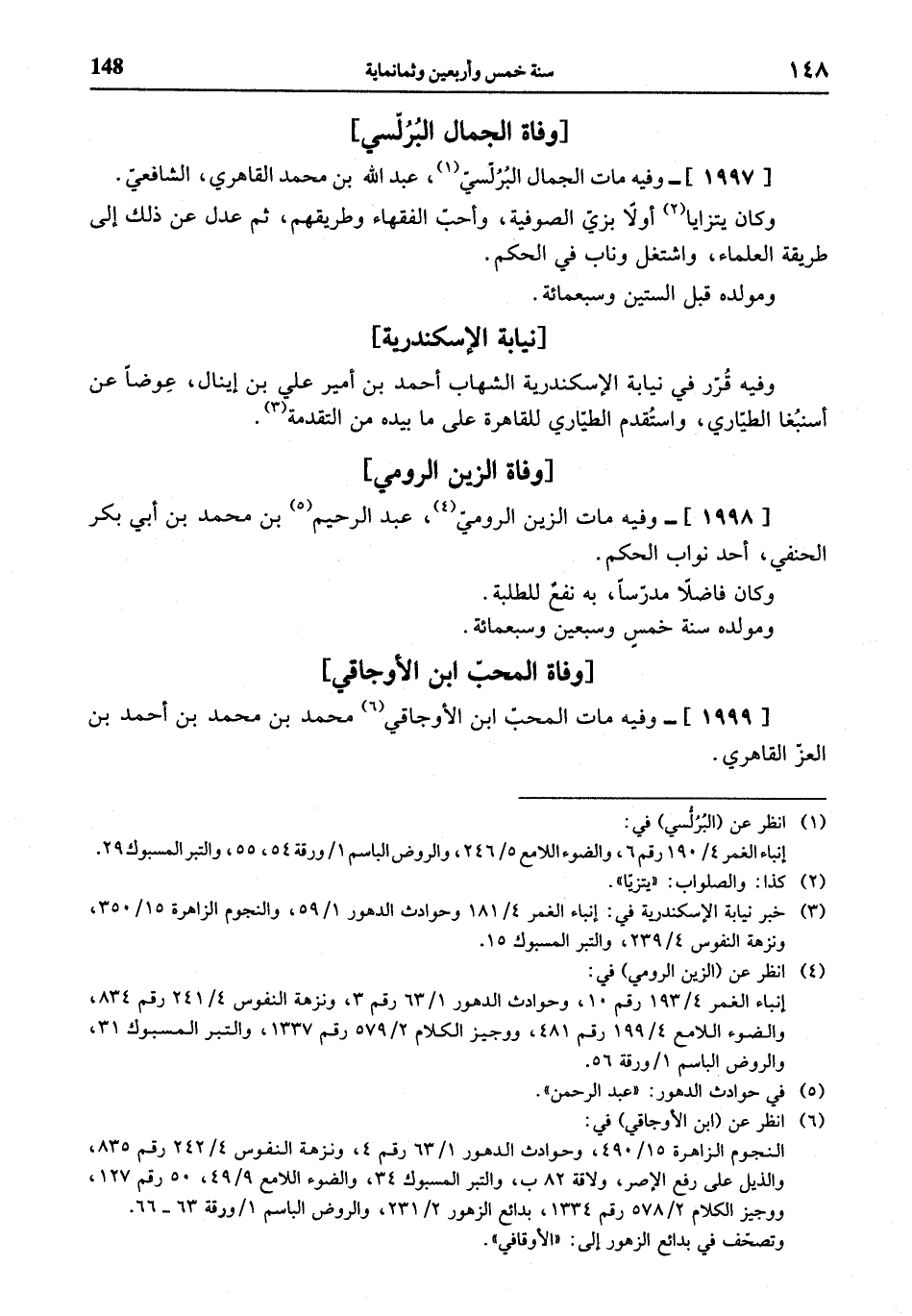 (¬6) انظر عن (ابن الأوجاقي) في: النجوم الزاهرة 15/ 490، وحوادث الدهور 1/ 63 رقم 4، ونزهة النفوس 4/ 242 رقم 835، والذيل على رفع الإصر، ولاقة 82 ب، والتبر المسبوك 34، والضوء اللامع 9/ 49، 50 رقم 127، ووجيز الكلام 2/ 578، رقم 1334، بدائع الزهور 2/ 231، والروض الباسم 1 / ورقة 63 - 66. وتصحّف في بدائع الزهور إلى: «الأوقافي».