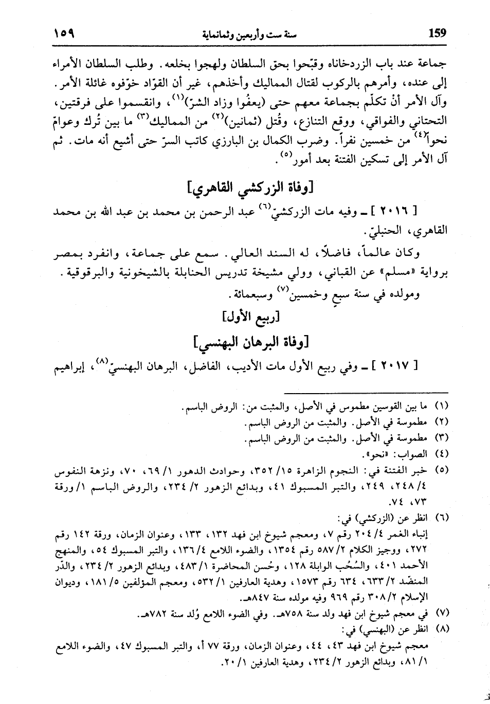 (¬6) انظر عن (الزركشي) في: إنباء الغمر 4/ 204 رقم 7، ومعجم شيوخ ابن فهد 132، 133، وعنوان الزمان، ورقة 142 رقم 272، ووجيز الكلام 2/ 587 رقم 1354، والضوء اللامع 4/ 136، والتبر المسبوك 54، والمنهج الأحمد 401، والسحب الوابلة 128، وحسن المحاضرة 1/ 483، وبدائع الزهور 2/ 234، والدرّ المنضّد 2/ 633، 634 رقم 1573، وهدية العارفين 1/ 532، ومعجم المؤلفين 5/ 181، وديوان الإسلام 2/ 308 رقم 969 وفيه مولده سنة 847 هـ.