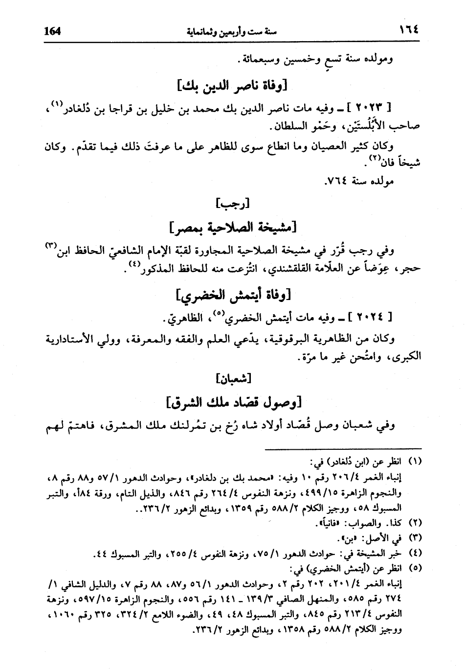 وفي شعبان وصل قصّاد أولاد شاه رخ بن تمرلنك ملك المشرق، فاهتمّ لهم