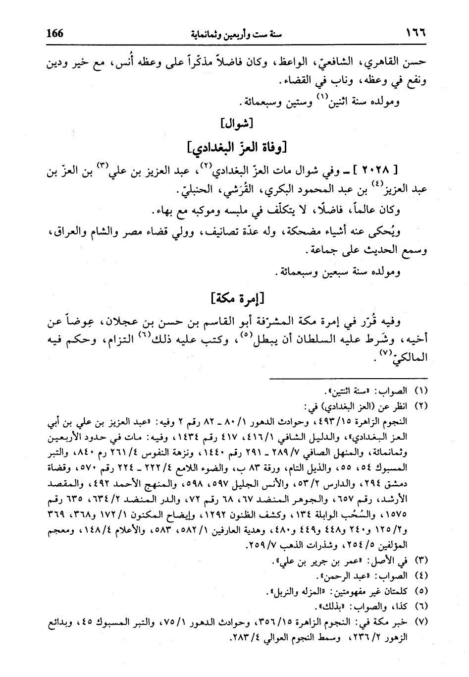(¬2) انظر عن (العز البغدادي) في: النجوم الزاهرة 15/ 493، وحوادث الدهور 1/ 80 - 82 رقم 2 وفيه: «عبد العزيز بن علي بن أبي العز البغدادي»، والدليل الشافي 1/ 416، 417 رقم 1434، وفيه: مات في حدود الأربعين وثمانمائة، والمنهل الصافي 7/ 289 - 291 رقم 1440، ونزهة النفوس 4/ 261 رم 840، والتبر المسبوك 54، 55، والذيل التام، ورقة 83 ب، والضوء اللامع 4/ 222 - 224 رقم 570، وقضاة دمشق 294، والدارس 2/ 53، والأنس الجليل 597، 598، والمنهج الأحمد 492، والمقصد الأرشد، رقم 657، والجوهر المنضد 67، 68 رقم 72، والدر المنضد 2/ 634، 635 رقم 1575، والسحب الوابلة 134، وكشف الظنون 1292، وإيضاح المكنون 1/ 172 و 368، 369 و 2/ 125 و 240 و 448 و 449 و 480، وهدية العارفين 1/ 582، 583، والأعلام 4/ 148، ومعجم المؤلفين 5/ 254، وشذرات الذهب 7/ 259.
