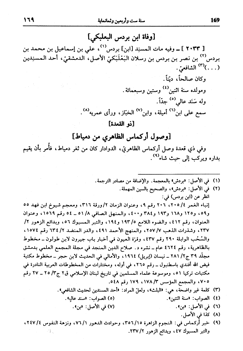 (¬2) في الأصل: «بردش»، والصحيح بالسين المهملة. انظر عن (ابن بردس) في: إنباء الغمر 4/ 205، 206 رقم 9، وعنوان الزمان 2 / ورقة 316، ومعجم شيوخ ابن فهد 55 و 59، و 125 و 168 و 193 و 384 و 400، والمنهل الصافي 8/ 51 - 54 رقم 1569، وعنوان العنوان، رقم 412، والضوء اللامع 5/ 193 و 194، والتبر المسبوك 56، وبدائع الزهور 2/ 237، وشذرات الذهب 7/ 257، والمنهج الأحمد 491، والدر المنضد 2/ 634 رقم 1574، والسحب الوابلة 290 رقم 437، وقرّة العيون في أخبار باب جيرون لابن طولون - مخطوط بالظاهرية، رقم 4624 عام - نشره د. صلاح الدين المنجد في مجلة المجمع العلمي بدمشق مجلّد 39 ج 2/ 281 - نيسان (إبريل) 1964، والأمالي في الحديث لابن حجر - مخطوط مكتبة فيض الله أفندي باسطنبول - رقم 265، في أوله، ومختارات من المخطوطات العربية النادرة في مكتبات تركيا 51، وموسوعة علماء المسلمين في تاريخ لبنان الإسلامي ق 2 ج 3/ 25 - 27 رقم 705، والمجمع المؤسس 3/ 178، 179 رقم 548.