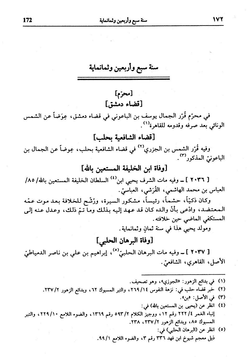 (¬4) انظر عن (يحيى بن المستعين بالله) في: إنباء الغمر 4/ 222 رقم 12، ووجيز الكلام 2/ 593 رقم 1369، والضوء اللامع 10/ 229، والتبر المسبوك 85، وبدائع الزهور 2/ 237، 238.