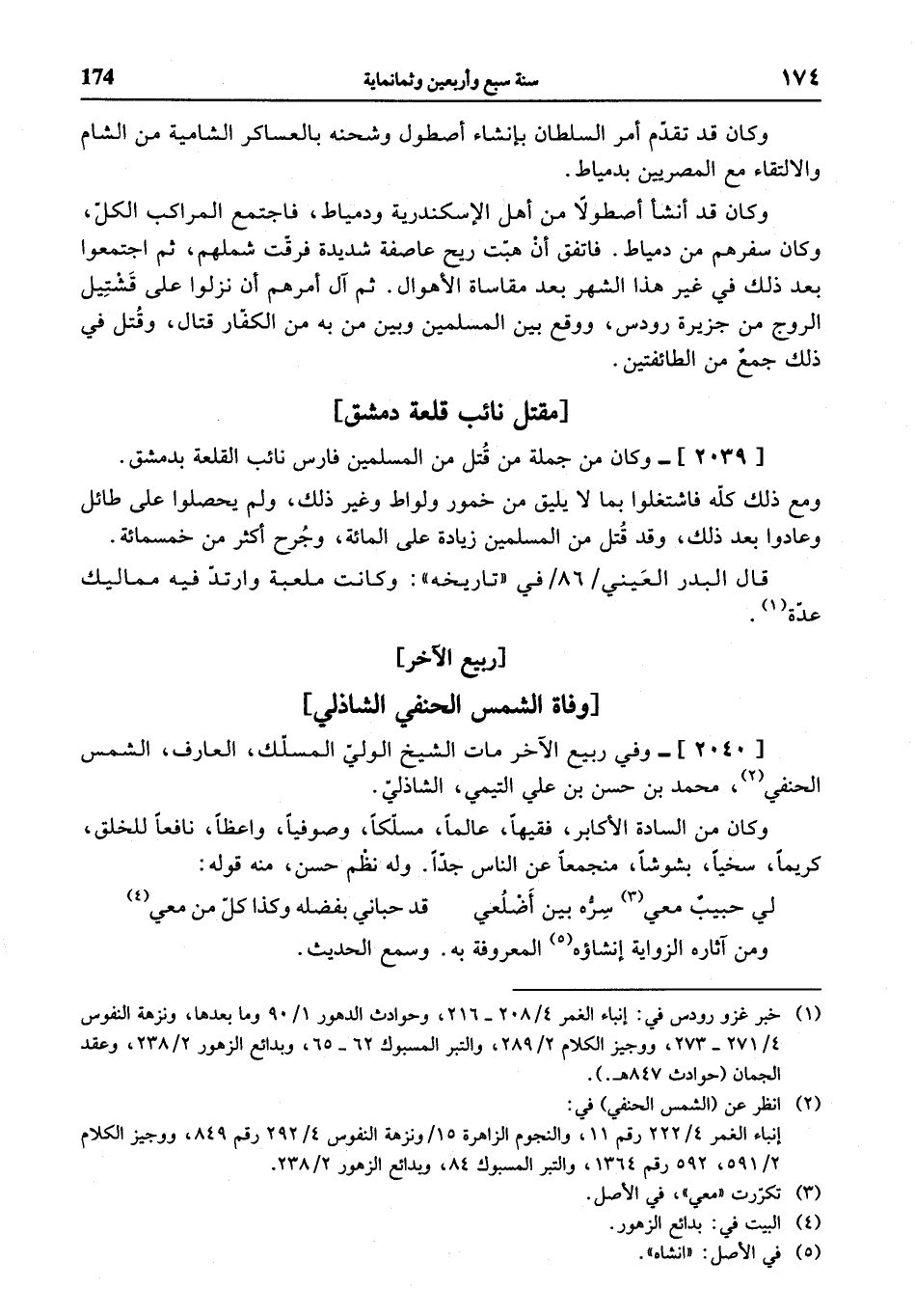 (¬1) خبر غزو رودس في: إنباء الغمر 4/ 208 - 216، وحوادث الدهور 1/ 90 وما بعدها، ونزهة النفوس 4/ 271 - 273، ووجيز الكلام 2/ 289، والتبر المسبوك 62 - 65، وبدائع الزهور 2/ 238، وعقد الجمان (حوادث 847 هـ.).